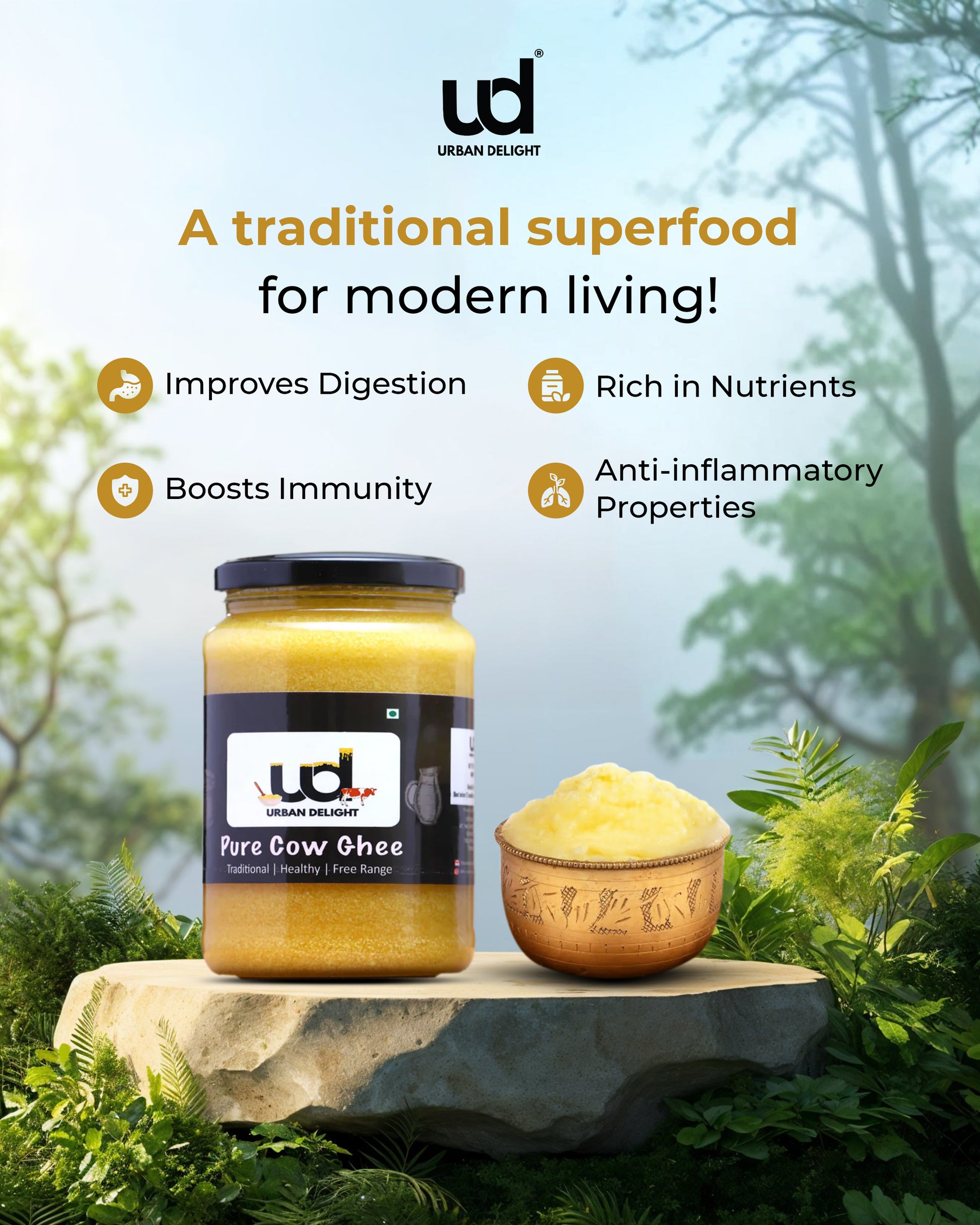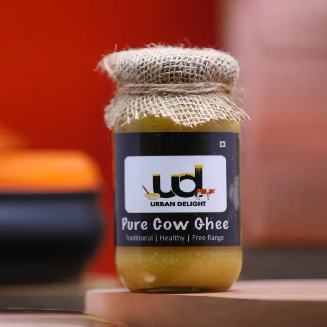 URBAN DELIGHT'S Cow Ghee is crafted from the finest cow's milk, ensuring unmatched purity and flavor. Our ghee is made using traditional methods to preserve its rich nutrients and offer maximum health benefits. It aids digestion, boosts immunity, and enhances the taste of every meal.